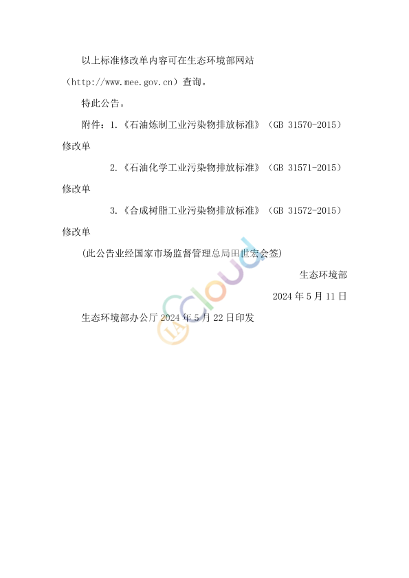 1. 《合成树脂工业污染物排放标准》(GB 31572•2015)修改单
