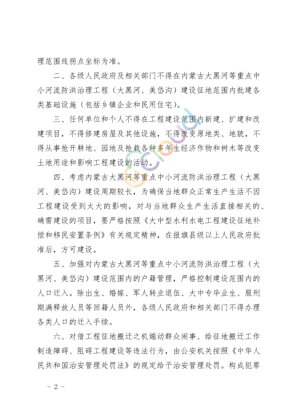 乌兰察布市人民政府,自治区各有关委、办、厅、局: 内蒙古大黑河等重点中小河流防洪治理工程(大黑河、美岱沟)是国家确定的“十五五”期间实施的重点项目之一。为确保工程建设征地和移民安置工作顺利实施,根据《大中型水利水电工程建设征地补偿和移民安置条例》(国务院令第679号)有关规定,现将有关事项通告如下: