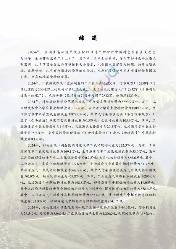 2024年, 全国生 态环境 系统坚 持以习 近 平新时代 中国特 色社会 主义思想为指导,全面贯彻党的二十大和二十届二中、三中全会精神,深入贯彻习近平生态文明思想,认真落实全国生态环境保护大会要求,以美丽中国建设为统领,持续攻坚克难、改革创新,扎实有力推进污染防治攻坚战,生态环境保护年度各项目标任务圆满完成,生态环境质量持续改善。 2024年,开展排放源统计重点调查的工业企业共178233家,污水处理厂15259家(含日处理能力500吨以上的农村污水处理设施),生活垃圾处理场(厂)2942家(含餐厨垃圾集中处理厂),危险废物(医疗废物)集中处理厂2822家,储油库1223个。 2024年,排放源统计调查范围内废水中化学需氧量排放量为2799.9万吨,其中,工业源废水中化学需氧量排放量为30.8万吨,农业源化学需氧量排放量为1889.6万吨,生活源污水中化学需氧量排放量为879.0万吨,集中式污染治理设施(不含污水处理厂)废水(含渗滤液)中化学需氧量排放量为0.5万吨;氨氮排放量为105.9万吨,其中,工业源废水中氨氮排放量为1.0万吨,农业源氨氮排放量为29.3万吨,生活源污水中氨氮排放量为75.5万吨,集中式污染治理设施(不含污水处理厂)废水(含渗滤液)中氨氮排放量为0.1万吨。 2024年,排放源统计调查范围内废气中二氧化硫排放量为222.3万吨,其中,工业源废气中二氧化硫排放量为169.1万吨,生活源废气中二氧化硫排放量为53.0万吨,集中式污染治理设施废气中二氧化硫排放量为0.2万吨;氮氧化物排放量为886.6万吨,其中,工业源废气中氮氧化物排放量为309.6万吨,生活源废气中氮氧化物排放量为33.3万吨,移动源废气中氮氧化物排放量为542.9万吨,集中式污染治理设施废气中氮氧化物排放量为0.9万吨;颗粒物排放量为469.8万吨,其中,工业源废气中颗粒物排放量为290.0万吨,生活源废气中颗粒物排放量为168.8万吨,移动源废气中颗粒物排放量为11.0万吨,集中式污染治理设施废气中颗粒物排放量为0.05万吨;挥发性有机物排放量为658.4万吨,其中,工业源废气中挥发性有机物排放量为222.4万吨,生活源废气中挥发性有机物排放量为181.8万吨,移动源废气中挥发性有机物排放量为254.1万吨。 2024年,排放源统计调查范围内一般工业固体废物产生量为44.0亿吨,综合利用量为26.5亿吨,处置量为8.0亿吨;工业危险废物产生量为1.20亿吨,利用处置量为1.18亿吨。
