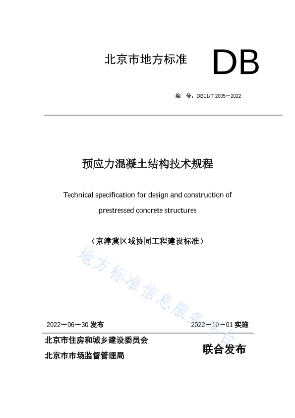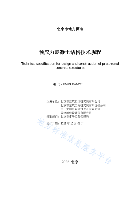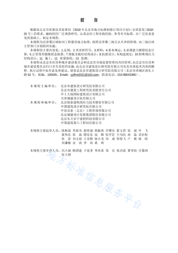 根据原北京市质量技术监督局(2018 年北京市地方标准制修订项目计划》(京质监发(2018)20号)的要求,编制组经广泛调查研究,认真总结工程实践经验,参考有关标准,在广泛征求意见的基础.上,制定本规程。 本规程为京津冀区域协同工程建设地方标准,按照京津冀三地互认共享的原则,由三地行政主管部门分别组织实施。 本规程的主要内容是: 1总则: 2.术语和符号: 3.材料: 4.基本规定: 5.承载能力极限状态计算: 6.正常使用极限状态验算: 7梁板及板柱结构设计: 8.抗震设计: 9.构造规定: 10.特 殊预应力结构设计: 11施工: 12. 质量验收: 13. 监测。 本规程由北京市住房和城乡建设委员会和北京市市场监督管理局共同管理,由北京市住房和城乡建设委员会归口并负责组织实施,由北京市建筑设计研究院有限公司负责具体技术内容的解释。执行过程中如有意见和建议,请寄送北京市建筑设计研究院有限公司(北京市西城区南礼士路62号,邮编: 100045, Email: yylhnt2021@163.com, 联系电话: 010-88043390) 。 本规程主编单位:北京市建筑设计研究院有限公司 北京市建筑工程研究院有限责任公司 中土大地国际建筑设计有限公司 天津城建设计院有限公司 本规程参编单位:北京银泰建构预应力技术股份有限公司 中国建筑设计研究院有限公司 中设安泰(北京)工程咨询有限公司 北京城建设计发展集团股份有限公司 北京东方京宁建材科技有限公司 中国建筑第六工程局有限公司 本规程主要起草人员:陈彬磊 李晨光 郝贵强 韩振勇 许曙东 霍文营 徐斌 叶飞 束伟农 徐焱 閣东东 高顺 张开臣 仝为民 孙磊 苗启松 张雷 刘文斑 王克峰 徐小龙 刘成 程俊飞 卢筱 陈晗 刘谦敏 余流 李培 奚琦 本规程主要审查人员:冯大斌 顾渭建 于连奎 李洪求 邹宏 张洪波 曹秀铂 任慕鸿 张大煦