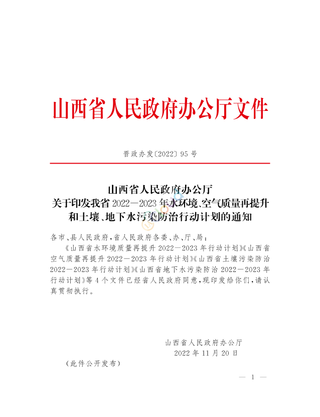 各市、县人民政府,省人民政府各委、办、厅、局: 《山西省水环境质量再提升2022-2023年行动计划》《山西省空气质量再提升2022-2023年行动计划》《山西省土壤污染防治2022-2023年行动计划》《山西省地下水污染防治2022-2023年行动计划》等4个文件已经省人民政府同意,现印发给你们,请认真贯彻执行。 山西省人民政府办公厅 2022年11月20日