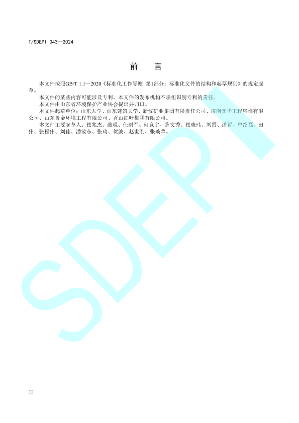 本文件按照GB/T 1.1—2020《标准化工作导则第1部分:标准化文件的结构和起草规则》的规定起草。 本文件的某些内容可能涉及专利。本文件的发布机构不承担识别专利的责任。 本文件由山东省环境保护产业协会提出并归口。 本文件起草单位:山东大学、山东建筑大学、新汶矿业集团有限责任公司、济南实华工程咨询有限公司、山东鲁金环境工程有限公司、香山红叶集团有限公司。 本文件主要起草人:崔兆杰、蔺琨、任丽军、何竞宇、薛文秀、崔晓玮、刘雷、潘哲、单绍磊、田伟、张程伟、刘佳、潘汝东、张琦、贺波、赵世刚、张琰苹。
