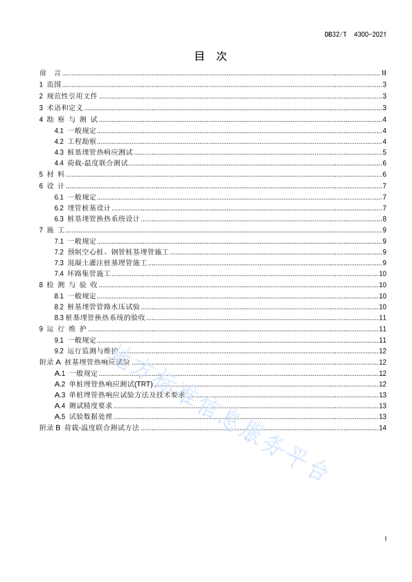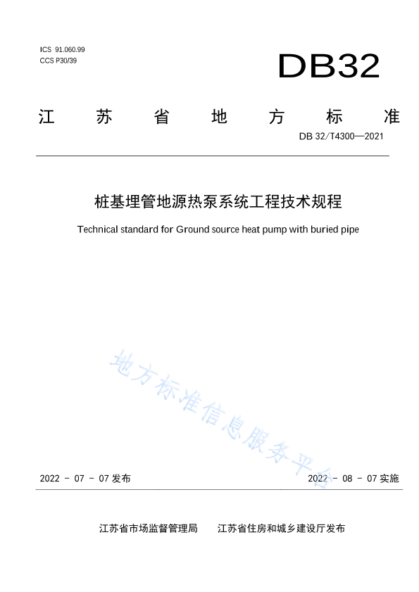 本标准规定了“ 桩基埋管地源热泵系统”工程技术的工程勘察、测试、设计、施工、验收及运行维护等内容。 本规程适用于江苏省行政区域内采用桩基埋管地源热泵换热系统的建筑工程。