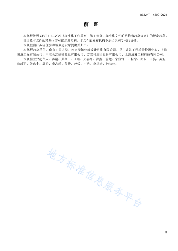 本规程按照GB/T 1.1- 2020《标准化工作导则第 1部分:标准化文件的结构和起草规则》的规定起草。 请注意本文件的某些内容可能涉及专利。本文件的发布机构不承担识别专利的责任。 本规程由江苏省住房和城乡建设厅提出并归口。 本规程起草单位:南京工业大学、南京城镇建筑设计咨询有限公司、昆山建筑工程质量检测中心、上海隧道工程有限公司、中煤长江基础建设有限公司、苏交科集团股份有限公司、上 海清隧工程科技有限公司。 本规程主要起草人:蒋刚、龚红卫、王琰、史春乐、洪鑫、管超、宗宸锋、王振宇、邵东、王昊、英旭、徐新丽、张忠宇、周游、李志远、吴倩、赵媛、王兵、李福清、孙长建。