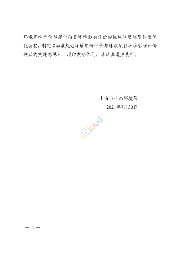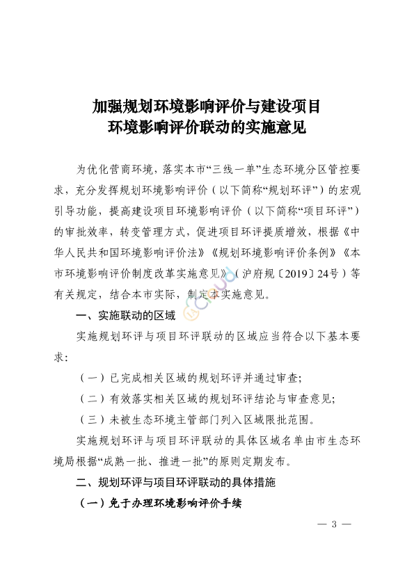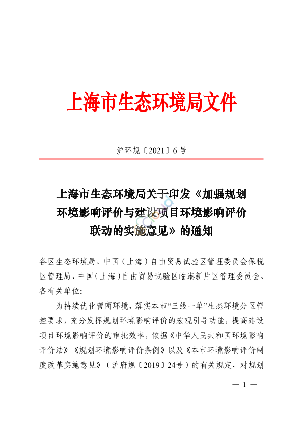 各区生态环境局、中国(上海)自由贸易试验区管理委员会保税区管理局、中国(上海)自由贸易试验区临港新片区管理委员会、各有关单位: 为持续优化营商环境,落实本市“三线一单”生态环境分区管控要求,充分发挥规划环境影响评价的宏观引导功能,提高建设项目环境影响评价的审批效率,依据《中华人民共和国环境影响评价法》《规划环境影响评价条例》以及《本市环境影响评价制度改革实施意见》(沪府规〔2019〕24号)的有关规定,对规划环境影响评价与建设项目环境影响评价的区域联动制度作出优化调整,制定《加强规划环境影响评价与建设项目环境影响评价联动的实施意见》。现印发给你们,请认真遵照执行。 上海市生态环境局 2021年7月30日