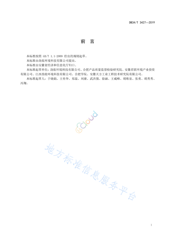 本标准按照 GB/T 1.1-2009 给出的规则起草。 本标准由劲旅环境科技有限公司提出。 本标准由安徽省经济和信息化厅归口。 本标准起草单位:劲旅环境科技有限公司、合肥产品质量监督检验研究院、安徽君联环境产业投资有限公司、江西劲旅环境科技有限公司、合肥学院、安徽天方工业工程技术研究院有限公司。 本标准起草人:于晓娟、王传华、郑磊、刘康、武洪强、徐涵、王威峰、胡维泉、张勇、胡秀秀、冯翔。
