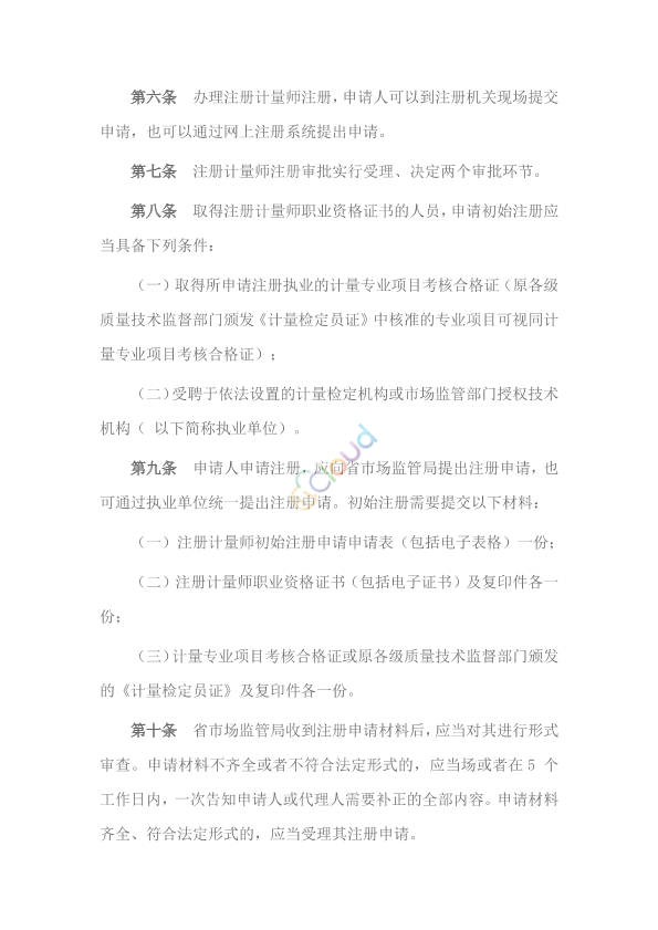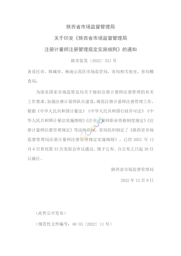 适用于陕西省辖区内注册计量师的注册及监管工作
