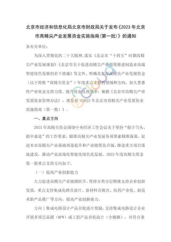 各有关单位: 为深入贯彻党的二十大精神,落实《北京市“十四五”时期高精尖产业发展规划》《北京市关于促进高精尖产业投资推进制造业高端智能绿色发展的若干措施》等文件,明确北京市高精尖产业发展资金(以下简称“高精尖资金”)年度重点支持的领域和方向,加大普惠性产业资金支持力度,提升资金兑现效率,根据《北京市高精尖产业发展资金管理办法》,现发布《2023年北京市高精尖产业发展资金实施指南(第一批)》。