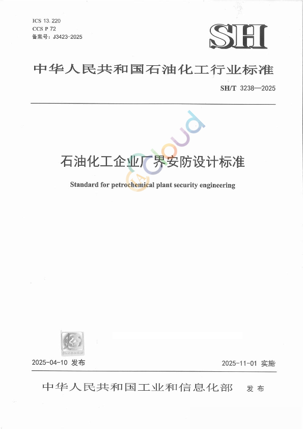本标准规定了石油化工企业厂界安防设计的基本规定、总体要求、实体防护设计、电子防护设计。 本标准适用于新建、改建、扩建的石油化工企业厂界安防的工程设计。