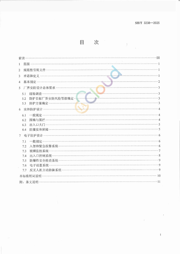 根据中华人民共和国工业和信息化部《2018.年第四批行业标准制修订计划的通知》(工信厅科[2018)73号)的要求,标准编制组经广泛调查研究,认真总结实践经验,参考有关国际标准和国外先进标准,并在广泛征求意见的基础上,制定本标准。 本标准共分7章。 本标准主要包括的内容有:范围、规范性引用文件、术语和定义、基本规定、厂界安防设计总体要求、实体防护设计、电子防护设计。 本标准由中国石油化工集团公司负责管理,由中国石油化工集团公司安全消防设计技术中心站负责日常管理,由中石化上海工程有限公司负责具体技术内容的解释。执行过程中如有意见和建议,请寄送日常管理单位和主编单位。 本标准日常管理单位:中国石油化工集团公司安全消防设计技术中心站 通讯地址:北京朝阳区安慧北里安园21号 邮政编码:100101 电话:010-84876994 邮箱: zhangli.sei@sinopec.com 本标准主编单位:中石化上海工程有限公司 通讯地址:上海市浦东新区张杨路769号 邮政编码:200120 电话:021-58366600-3337 箱:jiawei.ssec@.sinopec.com 本标准参编单位:中国石化健康安全环保管理部 中国石化工程建设有限公司 中石化宁波工程有限公司 上海天跃科技股份有限公司 江苏固耐特围栏系统股份有限公司 中石化广州工程有限公司 中石化安全工程研究院有限公司 中国石化上海石油化工股份有限公司 本标准主要起草人员:贾微 朱逸 沙裕 王若青 王强 徐永汉 朱群 朱红 张迪 彭华 胡晓昕 周慧敏 贾萍 王晓飞 王浩喆 孙伟心 张翼 王东 本标准主要审查人员:文科武 葛春玉 黄云松 温一平 张武星 郑园 丁敏 冯霞 李汉 冯双虎 李冬 苏晓妹 王金良 宋贤生 王晋波 李少鹏 齐青 张力 本标准2025年首次发布。