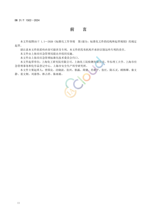 本文件按照GB/T 1.1—2020《标准化工作导则 第1部分:标准化文件的结构和起草规则》的规定起草。 请注意本文件的某些内容可能涉及专利。本文件的发布机构不承担识别这些专利的责任。 本文件由上海市应急管理局提出并组织实施。 本文件由上海市应急管理标准化技术委员会归口。 本文件起草单位:上海化工研究院有限公司、上海化工院检测有限公司、华东理工大学、上海市应急管理事务和化学品登记中心、上海市安全生产科学研究所。 本文件主要起草人:曾国良、沈晓波、张州、郭露、周健、肖秋平、张红、陈石灵、顾韩卿、秦文静、姜文炯、刘嘉伟、林占祥、陈雨霜。