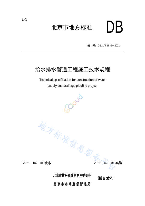 1.0.1 为提升北京市给水排水管道工程施工的技术管理水平,规范施工技术,确保工程质量,安全生产,节约材料,经济合理,制定本规程。 1.0.2 本规程适用于北京市行政区域内,新建、扩建、改建的城市室外给水排水管道工程的施工。 1.0.3 室外给水排水管道工程施工,除应符合本规程的规定外,尚应符合国家及北京市现行有关标准的规定。