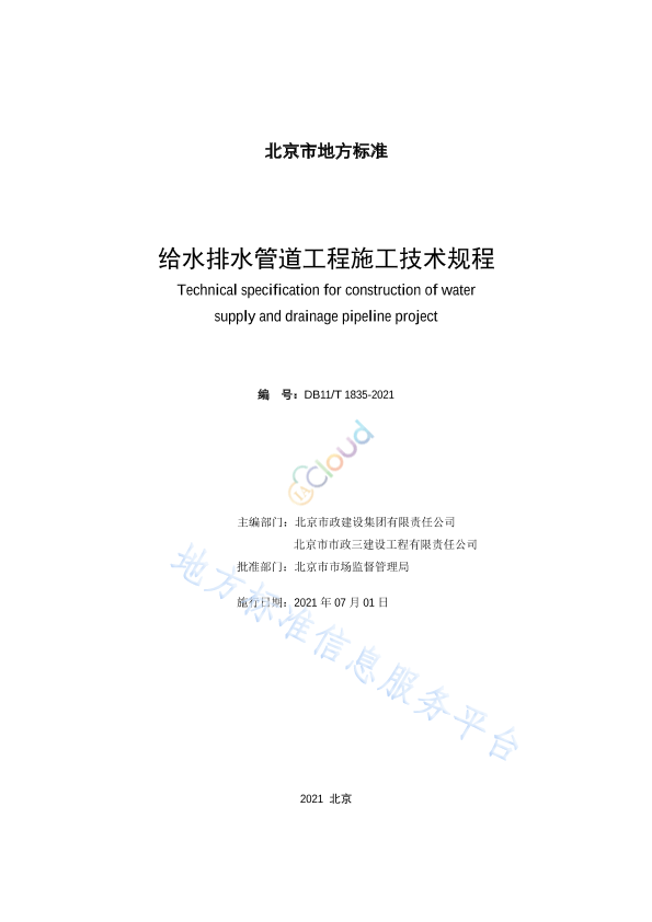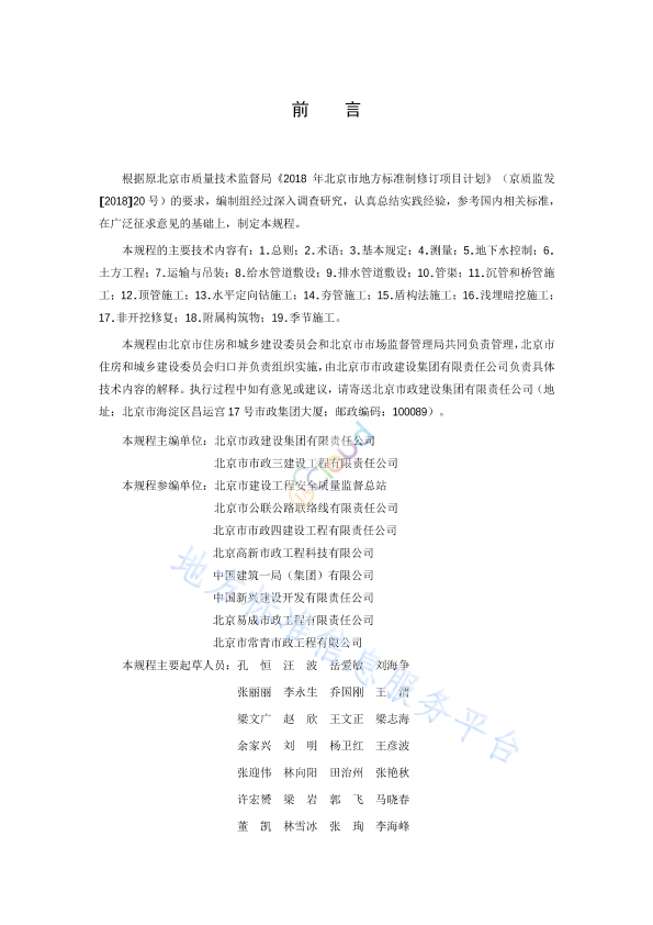 根据原北京市质量技术监督局《2018 年北京市地方标准制修订项目计划》(京质监发[2018]20号)的要求,编制组经过深入调查研究,认真总结实践经验,参考国内相关标准,在广泛征求意见的基础上,制定本规程。 本规程的主要技术内容有:1.总则;2.术语;3.基本规定;4.测量;5.地下水控制;6.土方工程;7.运输与吊装;8.给水管道敷设;9.排水管道敷设;10.管渠;11.沉管和桥管施工;12.顶管施工;13.水平定向钻施工;14.夯管施工;15.盾构法施工;16.浅埋暗挖施工; 17.非开挖修复;18.附属构筑物;19.季节施工。 本规程由北京市住房和城乡建设委员会和北京市市场监督管理局共同负责管理,北京市住房和城乡建设委员会归口并负责组织实施,由北京市市政建设集团有限责任公司负责具体技术内容的解释。执行过程中如有意见或建议,请寄送北京市政建设集团有限责任公司(地 址:北京市海淀区昌运宫17 号市政集团大厦;邮政编码:100089)。 本规程主编单位:北京市政建设集团有限责任公司 北京市市政三建设工程有限责任公司 本规程参编单位:北京市建设工程安全质量监督总站 北京市公联公路联络线有限责任公司 北京市市政四建设工程有限责任公司 北京高新市政工程科技有限公司 中国建筑一局(集团)有限公司 中国新兴建设开发有限责任公司 北京易成市政工程有限责任公司 北京市常青市政工程有限公司 本规程主要起草人员:孔恒 汪 波 岳爱敏 刘海争 张丽丽 李永生 乔国刚 王 渭 梁文广 赵 欣 王文正 梁志海 余家兴 刘 明 杨卫红 王彦波 张迎伟 林向阳 田治州 张艳秋 许宏赟 梁 岩 郭 飞 马晓春 董 凯 林雪冰 张 珣 李海峰 王亚杰 本规程主要审查人员:焦永达 陈英盈 李红专 刘其铎 李海燕 王增义 唐永讯
