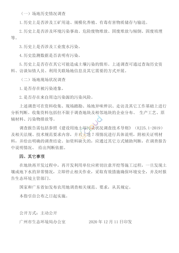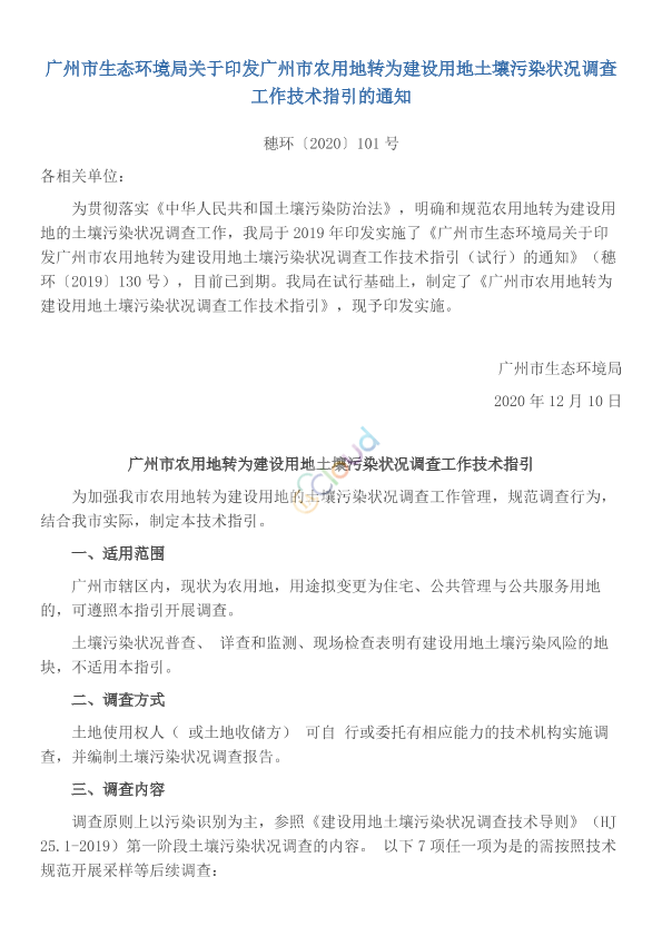 各相关单位: 为贯彻落实《中华人民共和国土壤污染防治法》,明确和规范农用地转为建设用地的土壤污染状况调查工作,我局于2019年印发实施了《广州市生态环境局关于印发广州市农用地转为建设用地土壤污染状况调查工作技术指引(试行)的通知》(穗环〔2019〕130号),目前已到期。我局在试行基础上,制定了《广州市农用地转为建设用地土壤污染状况调查工作技术指引》,现予印发实施。 广州市生态环境局 2020年12月10日