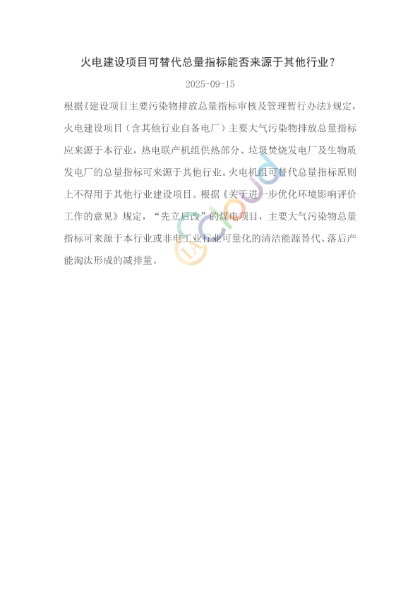 根据《建设项目主要污染物排放总量指标审核及管理暂行办法》规定,火电建设项目(含其他行业自备电厂)主要大气污染物排放总量指标应来源于本行业,热电联产机组供热部分、垃圾焚烧发电厂及生物质发电厂的总量指标可来源于其他行业。火电机组可替代总量指标原则上不得用于其他行业建设项目。根据《关于进一步优化环境影响评价工作的意见》规定,“先立后改”的煤电项目,主要大气污染物总量指标可来源于本行业或非电工业行业可量化的清洁能源替代、落后产能淘汰形成的减排量。