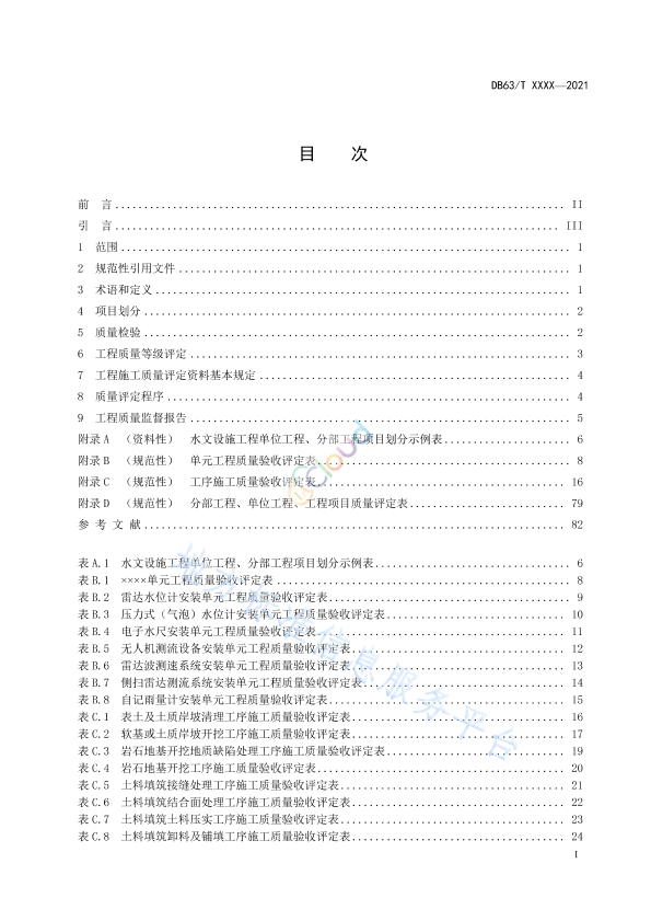 本文件规定了水文设施工程项目划分的原则、工程质量评定标准、质量等级评定程序及内容等。 本文件适用于各类新建、改建、扩建、迁建的水文设施工程的施工质量检验评定。 注:水文生产、业务用房工程质量评定按GB 50300执行。