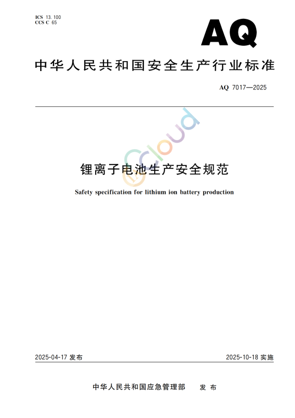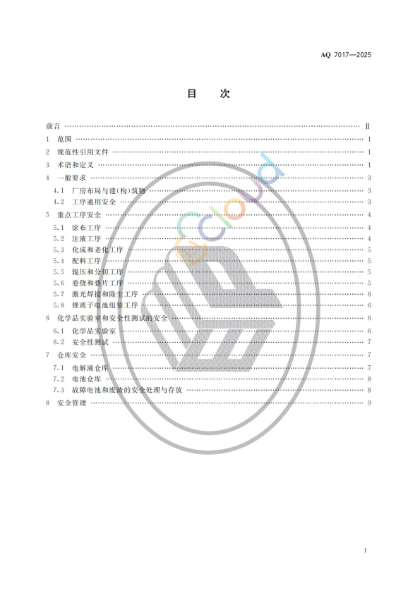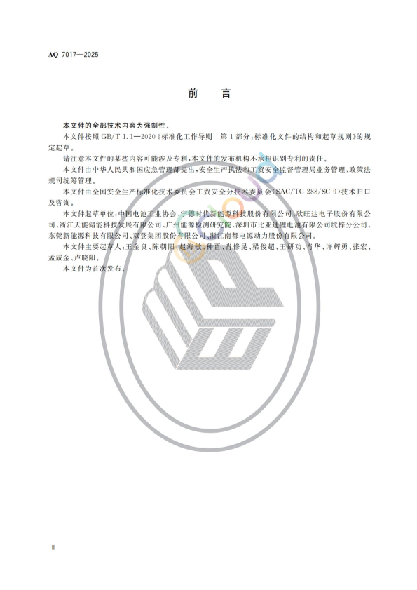 本文件的全部技术内容为强制性。 本文件按照GB/T1.1一2020《标准化工作导则第1部分:标准化文件的结构和起草规则》的规定起草。 请注意本文件的某些内容可能涉及专利,本文件的发布机构不承担识别专利的责任。 本文件由中华人民共和国应急管理部提出,安全生产执法和工贸安全监督管理局业务管理,政策法规司统筹管理。 本文件由全国安全生产标准化技术委员会工贸安全分技术委员会(SAC/TC288/SC9)技术归口及咨询。 本文件起草单位:中国电池工业协会、宁德时代新能源科技股份有限公司,欣旺达电子股份有限公司、浙江天能储能科技发展有限公司、广州能源检测研究院、深圳市比亚迪锂电池有限公司坑梓分公司、东莞新能源科技有限公司、双登集团股份有限公司、浙江南都电源动力股份有限公司。 本文件主要起草人;王金良、陈朝阳、赵海敏、种晋、肖修昆、梁俊超、王研功、肖华、许辉勇、张宏、孟咸金、卢晓阳。 本文件为首次发布。