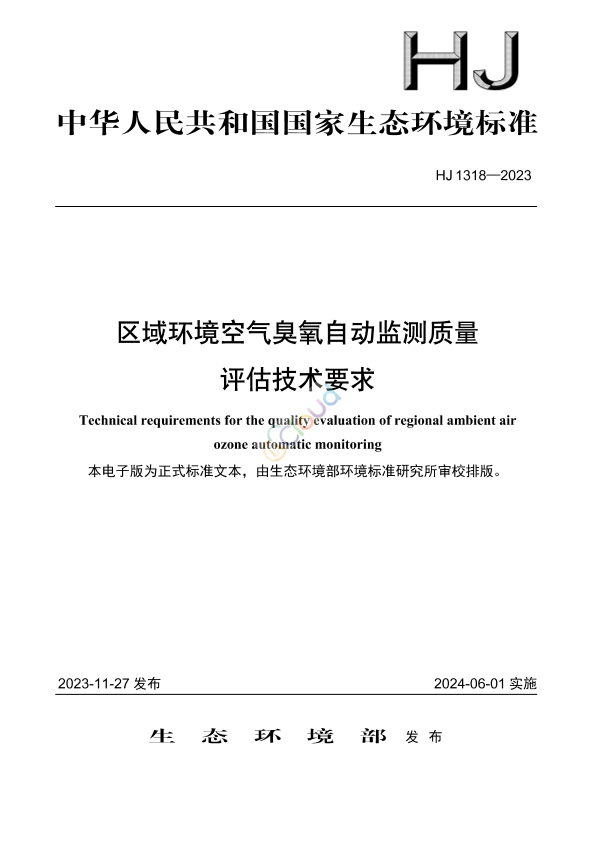 为贯彻《中华人民共和国环境保护法》《中华人民共和国大气污染防治法》,防治生态环境污染,改善生态环境质量,规范环境空气臭氧自动监测质量评估工作,制定本标准。 本标准规定了区域环境空气臭氧自动监测质量评估的工作流程、仪器和设备、质量评估目标、评估区域及点位抽样、现场检查与比对、质量评估、质量保证与质量控制等内容。 本标准的附录 A~附录 C 为资料性附录。 本标准为首次发布。 本标准由生态环境部生态环境监测司、法规与标准司组织制订。 本标准主要起草单位:中国环境监测总站、北京市生态环境监测中心、河北省生态环境应急与重污染天气预警中心。 本标准生态环境部 2023 年 11 月 27 日批准。 本标准自 2024 年 6 月 1 日起实施。 本标准由生态环境部解释。