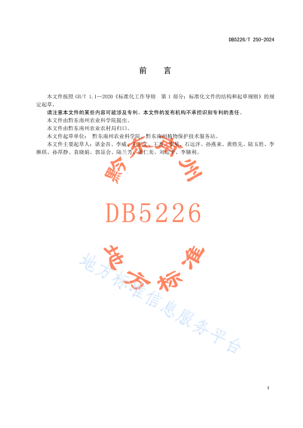 本文件按照 GB/T 1.1—2020《标准化工作导则 第 1 部分:标准化文件的结构和起草规则》的规定起草。 请注意本文件的某些内容可能涉及专利。本文件的发布机构不承担识别专利的责任。 本文件由黔东南州农业科学院提出。 本文件由黔东南州农业农村局归口。 本文件起草单位: 黔东南州农业科学院、黔东南州植物保护技术服务站。
