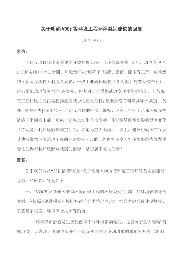 来信: 《建设项目环境影响评价分类管理名录》(环保部令第44号,2017年9月1日起实施)中“三十四、环境治理业”明确了“脱硫、脱硝、除尘等工程,危险废物(含医疗废物)利用及处置,一般工业固体废物(含污泥)处置及综合利用,污染场地治理修复”等环评类别,但是对于仅增加或改变环境保护措施,且与现有工程相比主要污染物排放量减少的建设项目,该名录没有明确其环评类别。 另外,依据环办[2015]52号,‘建设项目的性质、规模、地点、生产工艺和环境保护措施五个因素中的一项或一项以上发生重大变动,且可能导致环境影响显著变化(特别是不利环境影响加重)的,界定为重大变动’。 综上,建议明确VOCs及其他污染物环境治理工程的环评类别(其他工程内容不变)?环境保护措施发生变化使得不利环境影响减弱的情形,是否属于重大变动?