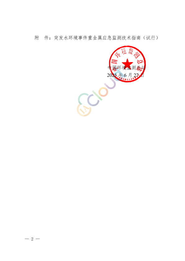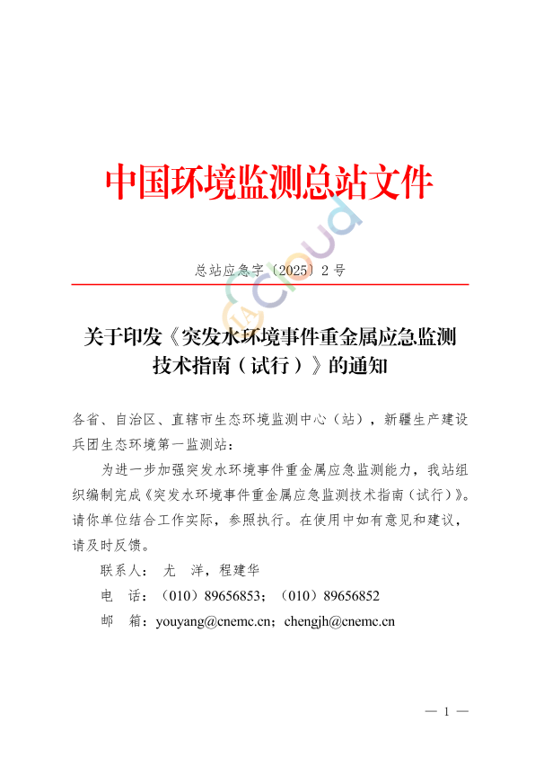 各省、自治区、直辖市生态环境监测中心(站),新疆生产建设兵团生态环境第一监测站: 为进一步加强突发水环境事件重金属应急监测能力,我站组织编制完成《突发水环境事件重金属应急监测技术指南(试行)》。请你单位结合工作实际,参照执行。在使用中如有意见和建议,请及时反馈。 联系人: 尤 洋,程建华 电 话:(010)89656853;(010)89656852 邮 箱:youyang@cnemc.cn;chengjh@cnemc.cn 中国环境监测总站 2025 年 6 月 27 日