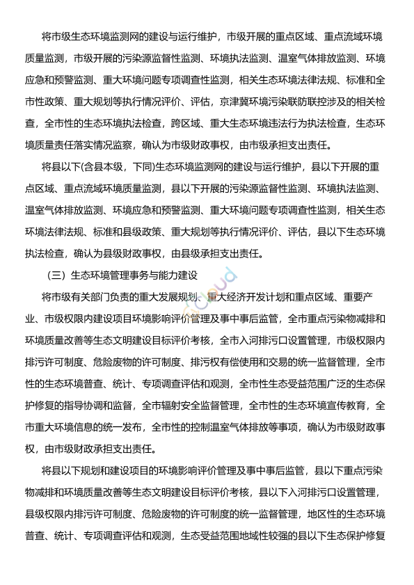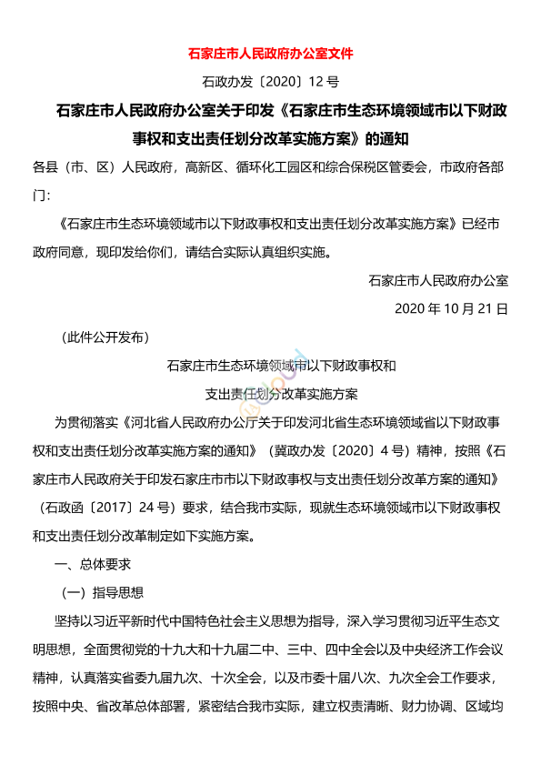 各县(市、区)人民政府,高新区、循环化工园区和综合保税区管委会,市政府各部门: 《石家庄市生态环境领域市以下财政事权和支出责任划分改革实施方案》已经市政府同意,现印发给你们,请结合实际认真组织实施。 石家庄市人民政府办公室 2020年10月21日