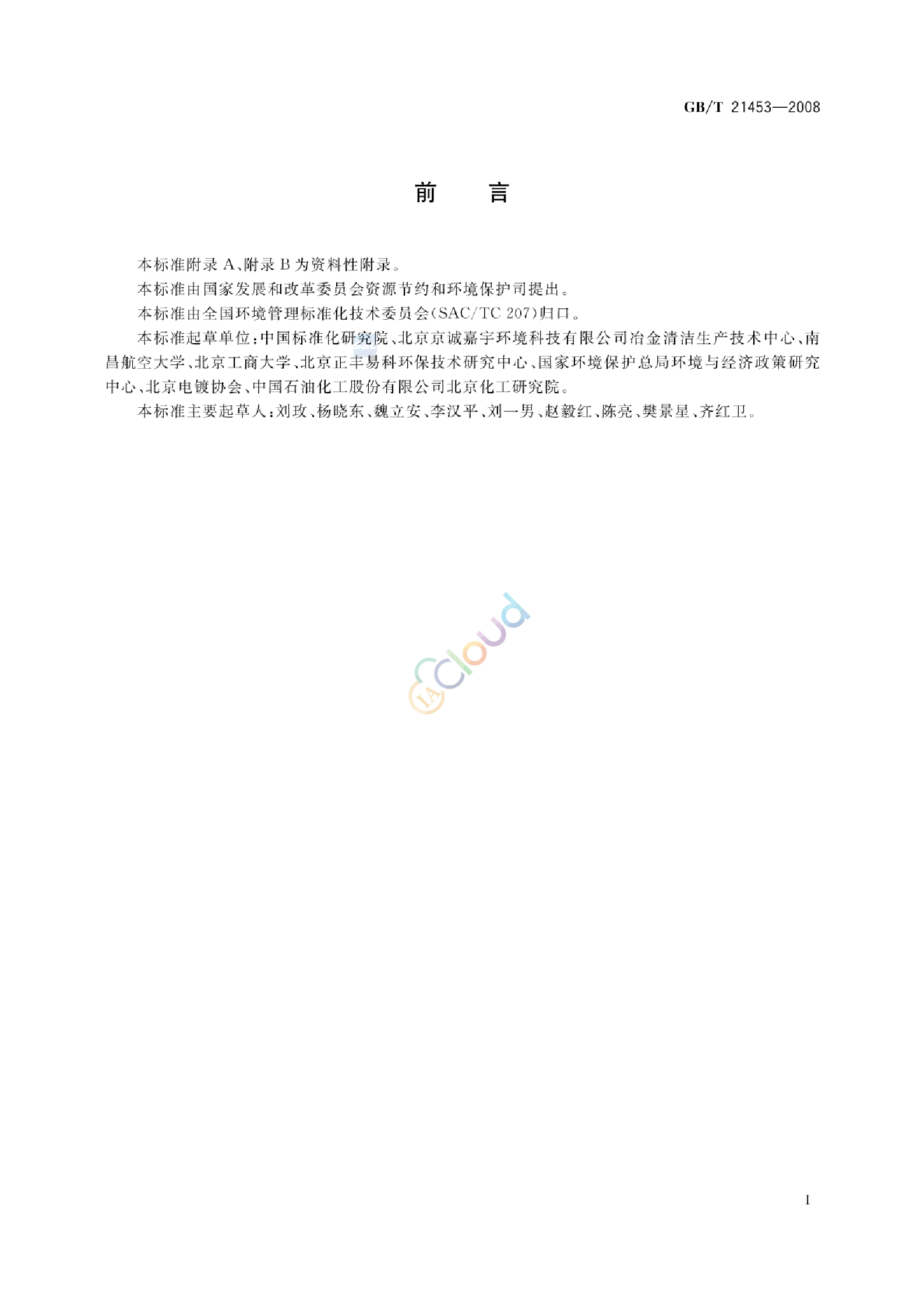 本标准附录A、附录B为资料性附录。 本标准由国家发展和改革委员会资源节约和环境保护司提出。 本标准由全国环境管理标准化技术委员会(SAC/TC207)归口。 本标准起草单位:中国标准化研究院、北京京诚嘉宇环境科技有限公司冶金清洁生产技术中心、南昌航空大学、北京工商大学、北京正丰易科环保技术研究中心、国家环境保护总局环境与经济政策研究中心、北京电镀协会、中国石油化工股份有限公司北京化工研究院。