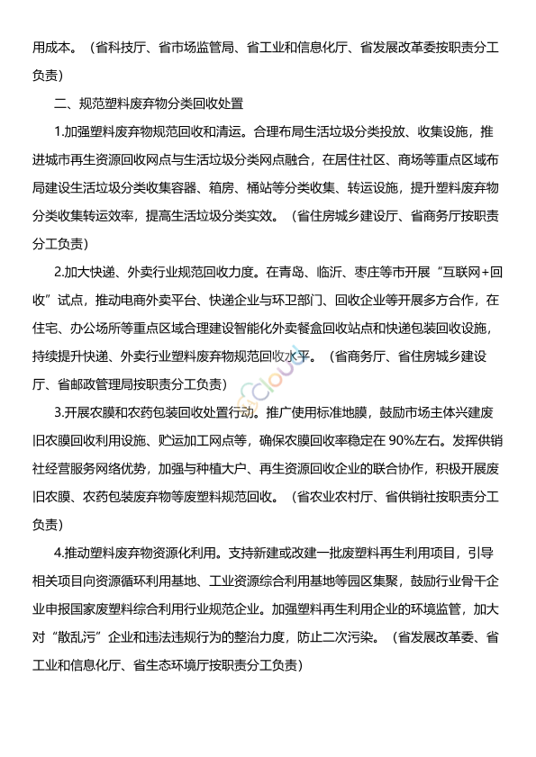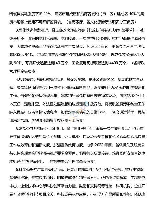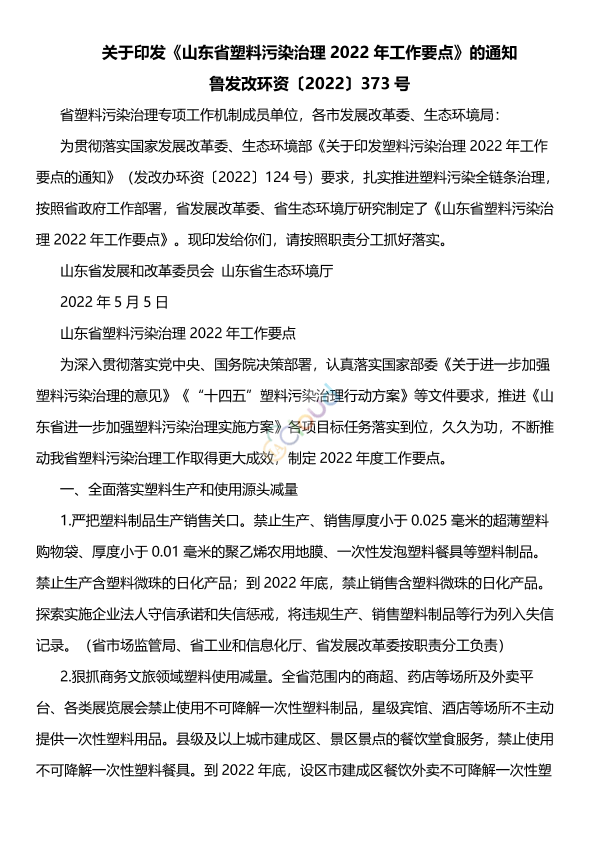 省塑料污染治理专项工作机制成员单位,各市发展改革委、生态环境局: 为贯彻落实国家发展改革委、生态环境部《关于印发塑料污染治理2022年工作要点的通知》(发改办环资〔2022〕124号)要求,扎实推进塑料污染全链条治理,按照省政府工作部署,省发展改革委、省生态环境厅研究制定了《山东省塑料污染治理2022年工作要点》。现印发给你们,请按照职责分工抓好落实。 山东省发展和改革委员会 山东省生态环境厅 2022年5月5日