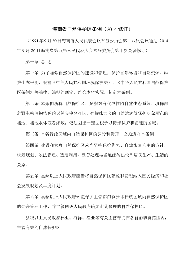 《海南省自然保护区条例》已由海南省第五届人民代表大会常务委员会第十次会议于2014年9月26日修订通过,现将修订后的《海南省自然保护区条例》公布,自2014年12月1日起施行。 海南省人民代表大会常务委员会 2014年9月26日