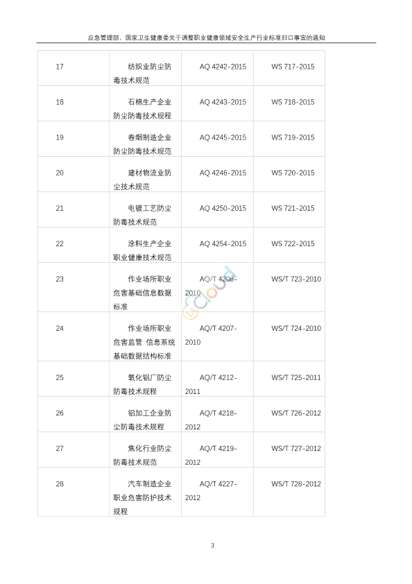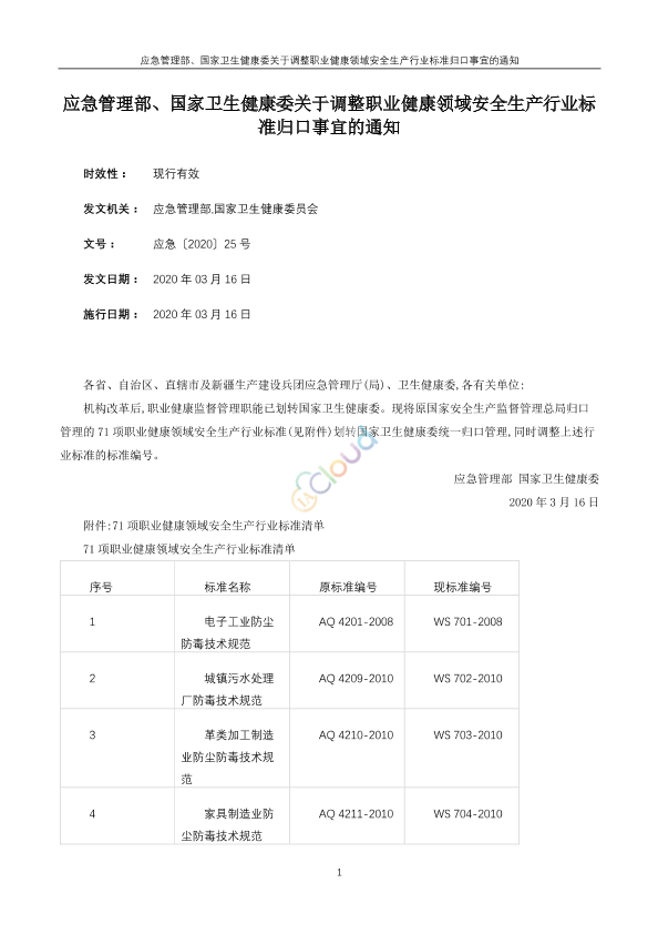 各省、自治区、直辖市及新疆生产建设兵团应急管理厅(局)、卫生健康委,各有关单位: 机构改革后,职业健康监督管理职能已划转国家卫生健康委。现将原国家安全生产监督管理总局归口管理的71项职业健康领域安全生产行业标准(见附件)划转国家卫生健康委统一归口管理,同时调整上述行业标准的标准编号。 应急管理部 国家卫生健康委 2020年3月16日