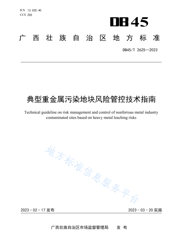 本文件规定了典型重金属污染地块风险管控的术语和定义、工作流程、环境调查、风险评估和风险管控。 本文件适用于广西壮族自治区行政区域内以生态恢复为目标的涉砷、铅、镉、锌等典型重金属污染地块风险管控。
