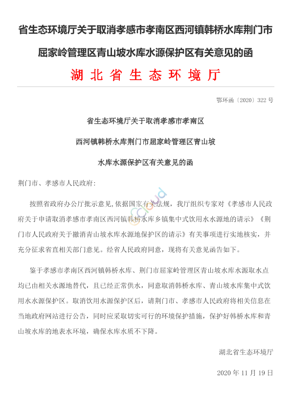 荆门市、孝感市人民政府: 按照省政府办公厅批示意见,依据国家有关法规,我厅组织专家对《孝感市人民政府关于申请取消孝感市孝南区西河镇韩桥水库乡镇集中式饮用水水源地的请示》《荆门市人民政府关于撤消青山坡水库水源地保护区的请示》有关事项进行实地核实,并充分征求省直相关部门意见。经省人民政府同意,现将有关意见函告如下。