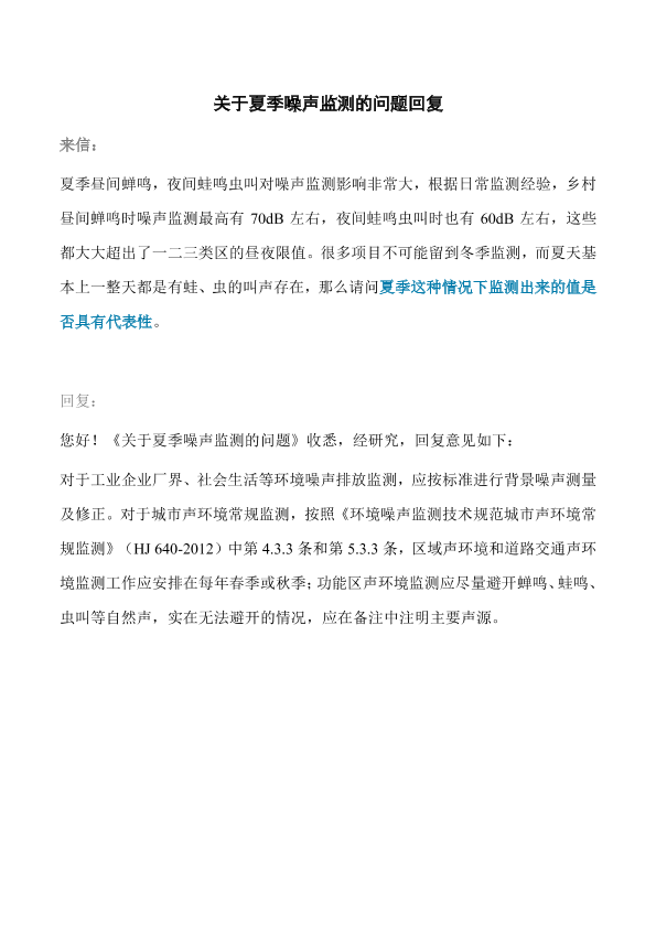 来信:夏季昼间蝉鸣,夜间蛙鸣虫叫对噪声监测影响非常大,根据日常监测经验,乡村昼间蝉鸣时噪声监测最高有 70dB 左右,夜间蛙鸣虫叫时也有 60dB 左右,这些都大大超出了一二三类区的昼夜限值。很多项目不可能留到冬季监测,而夏天基本上一整天都是有蛙、虫的叫声存在,那么请问 夏季这种情况下监测出来的值是否具有代表性。