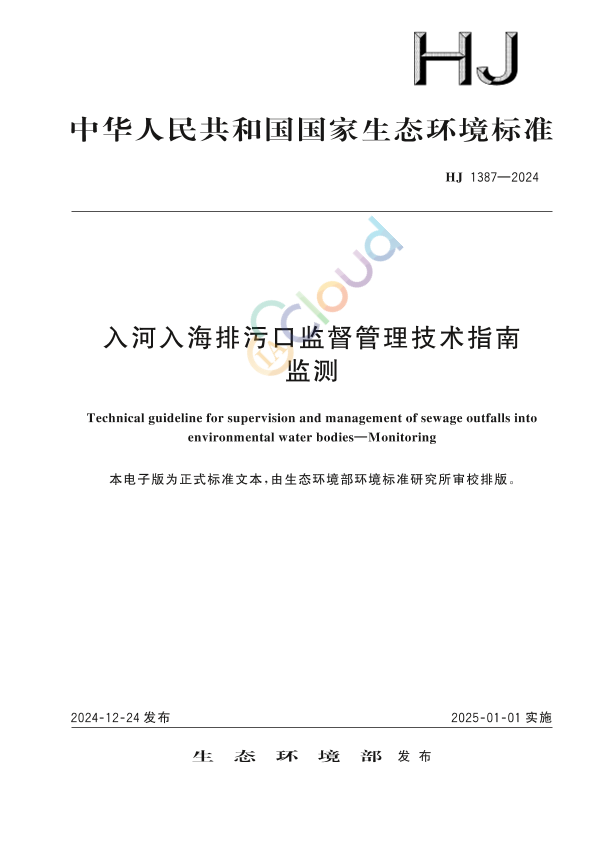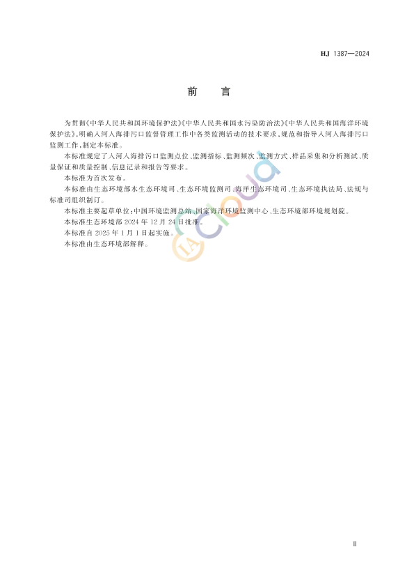 为贯彻《中华人民共和国环境保护法》《中华人民共和国水污染防治法》《中华人民共和国海洋环境保护法》,明确入河入海排污口监督管理工作中各类监测活动的技术要求,规范和指导入河入海排污口监测工作,制定本标准。 本标准规定了入河入海排污口监测点位、监测指标、监测频次、监测方式、样品采集和分析测试、质量保证和质量控制、信息记录和报告等要求。 本标准为首次发布。 本标准由生态环境部水生态环境司、生态环境监测司、海洋生态环境司、生态环境执法局、法规与标准司组织制订。 本标准主要起草单位:中国环境监测总站、国家海洋环境监测中心、生态环境部环境规划院。 本标准生态环境部 2024 年 12 月 24 日批准。 本标准自 2025 年 1 月 1 日起实施。 本标准由生态环境部解释。