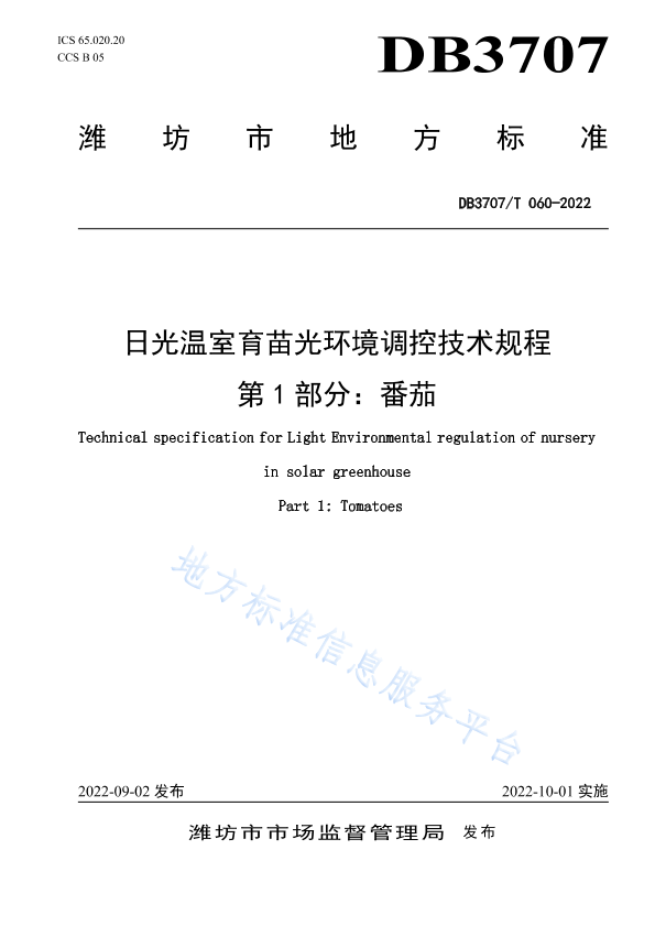 本文件规定了低温寡照条件下日光温室番茄育苗光环境调控技术的育苗方式、技术要求、成苗标准和生产档案。 本文件适用于潍坊市日光温室低温季节番茄育苗的光环境调控和管理。