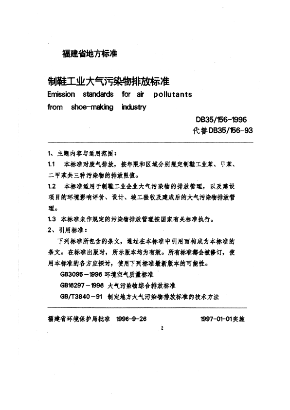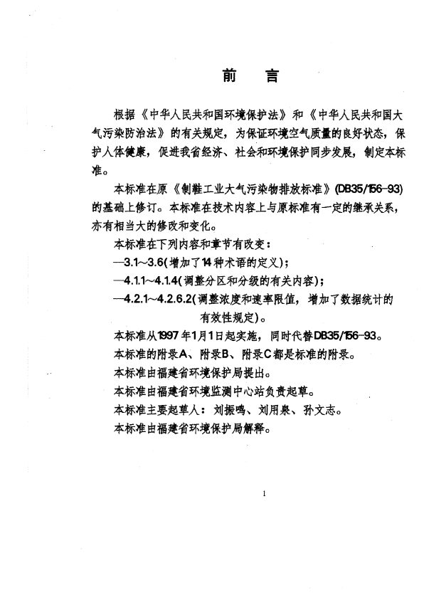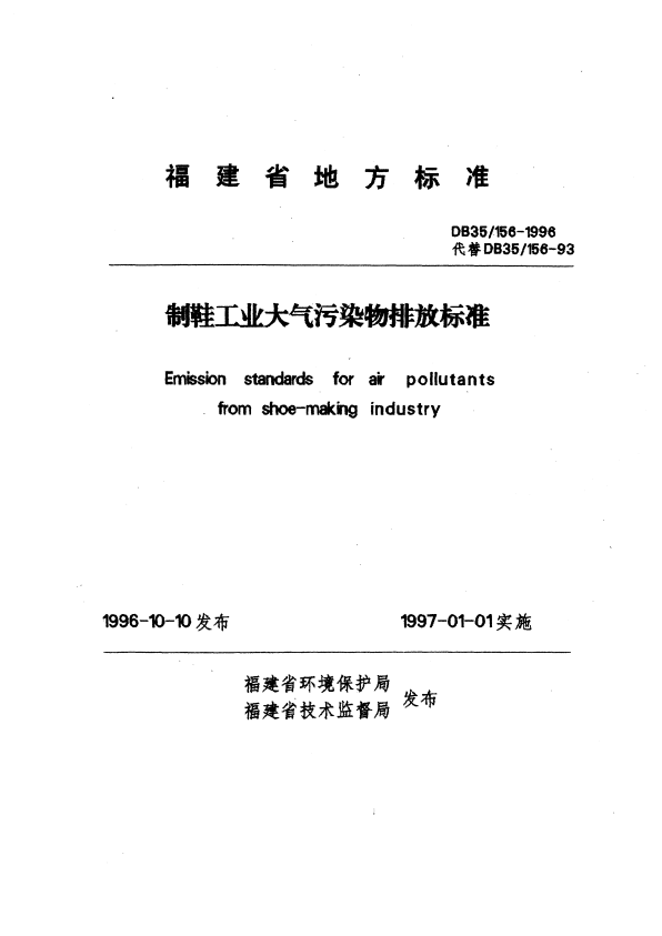 本标准在原《制鞋工业大气污染物排放标准》(DB35/156-93)的基础上修订。本标准在技术内容上与原标准有一定的继承关系,亦有相当大的修改和变化。