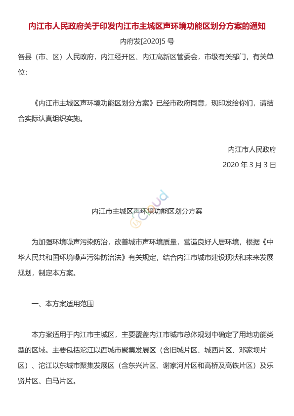 各县(市、区)人民政府,内江经开区、内江高新区管委会,市级有关部门,有关单位: 《内江市主城区声环境功能区划分方案》已经市政府同意,现印发给你们,请结合实际认真组织实施。 内江市人民政府 2020年3月3日