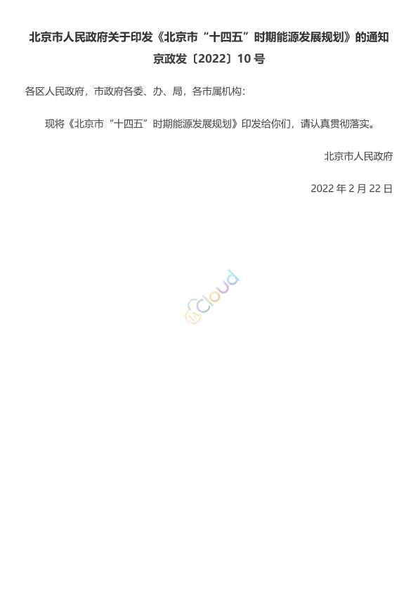 各区人民政府,市政府各委、办、局,各市属机构: 现将《北京市“十四五”时期能源发展规划》印发给你们,请认真贯彻落实。 北京市人民政府 2022年2月22日