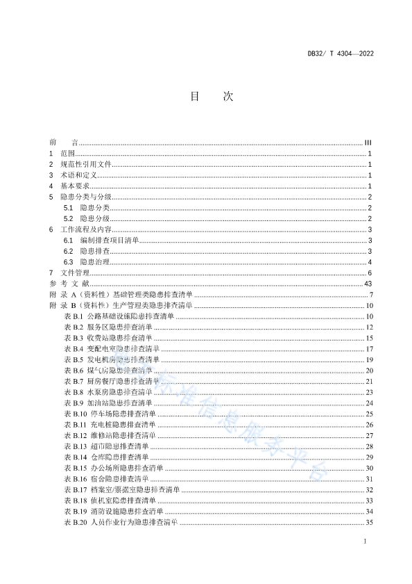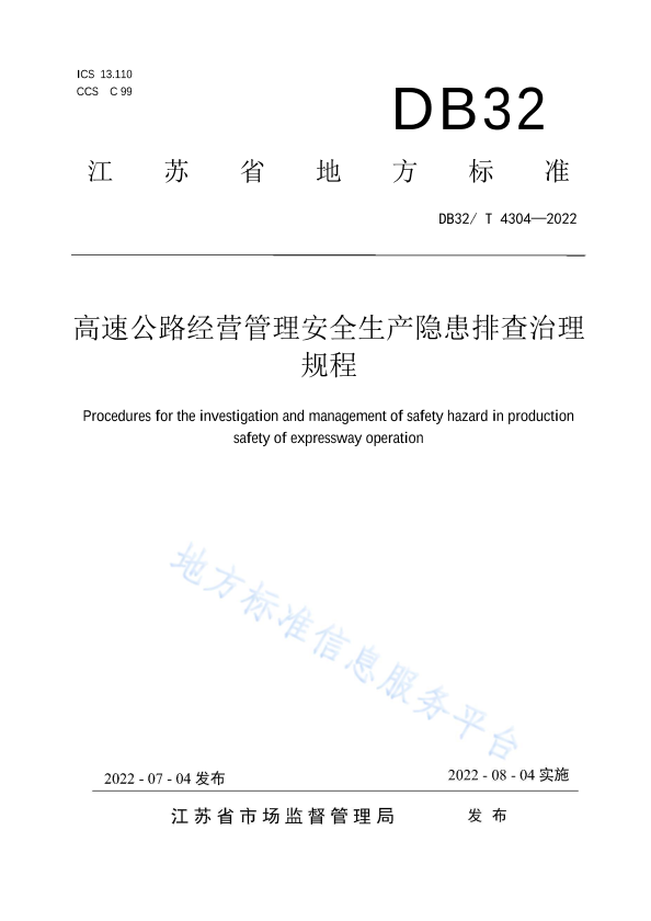 本文件规定了高速公路经营管理隐患排查治理的、基本要求、隐患分类分级、工作程序和内容和文件管理。 本文件适用于江苏省内高速公路经营管理单位开展安全生产隐患排查治理工作以及行业主管部门开展监督检查使用。