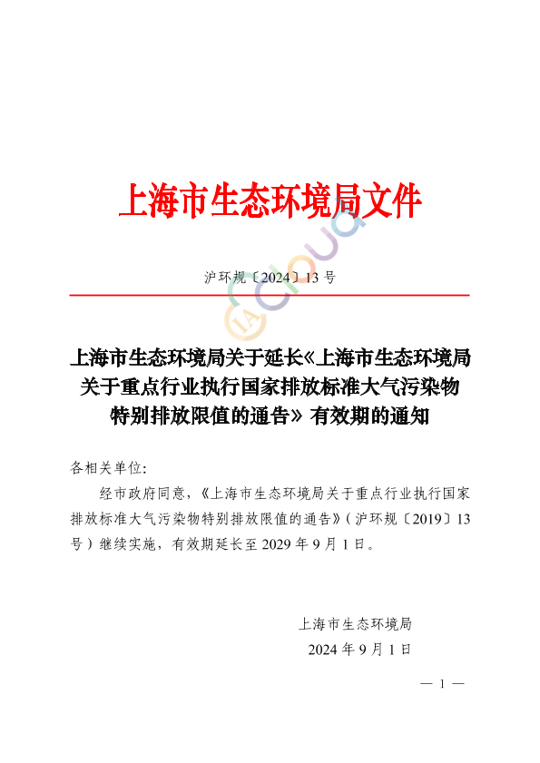 1. 文件标题:《上海市生态环境局关于延长《上海市生态环境局关于重点行业执行国家排放标准大气污染物特别排放限值的通告》有效期的通知》。