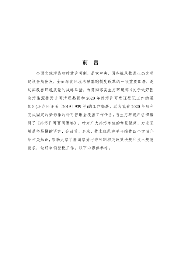 全面实施污染物排放许可制,是党中央、国务院从推进生态文明建设全局出发,全面深化环境治理基础制度改革的一项重要部署,是切实改善环境质量的战略举措。为贯彻落实生态环境部《关于做好固定污染源排污许可清理整顿和2020 年排污许可发证登记工作的通知》(环办环评函〔2019〕939 号)的工作部署,助力我省2020 年顺利完成固定污染源排污许可管理全覆盖工作任务。省生态环境厅组织编辑了《排污许可百问百答》,针对广大排污单位的常见疑问,力求采用通俗易懂的语言,分政策、名录、技术规范和平台操作四个方面介绍相关知识,帮助大家了解国家排污许可制相关政策法规和技术规范要求,做好申领登记工作。以下内容供参考。