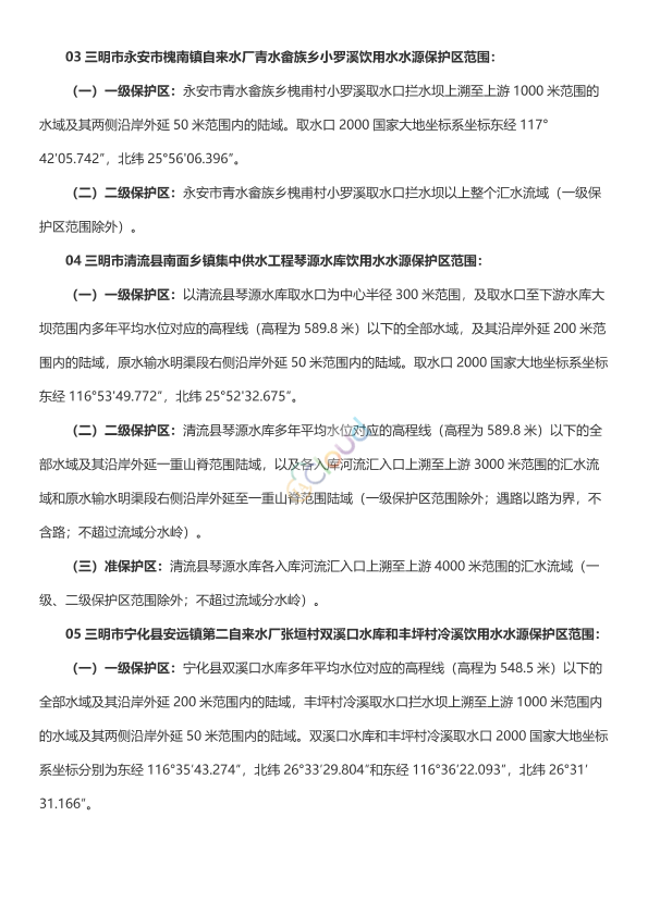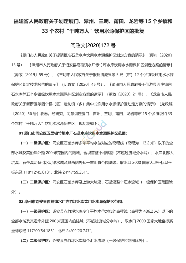 《厦门市人民政府关于提请批准石垄水库饮用水水源保护区划定方案的请示》(厦府〔2020〕13号)、《漳州市人民政府关于诏安县霞葛镇水厂赤竹坪水库饮用水水源保护区划定方案的请示》(漳政〔2019〕59号)、《三明市人民政府关于报批清流县等5县(市)12个乡镇级饮用水水源保护区划定技术报告的请示》(明政文〔2020〕45号)、《莆田市人民政府关于仙游县园庄镇东石水库等五个乡镇级饮用水水源保护区划定方案的请示》(莆政〔2020〕21号)、《龙岩市人民政府关于新罗区等四个县(区)建制镇(乡)集中式饮用水水源保护区划定方案的请示》(龙政综〔2020〕56号)收悉。经研究,同意划定厦门、漳州、三明、莆田、龙岩等市15个乡镇级和33个农村“千吨万人”饮用水水源保护区,现批复如下: