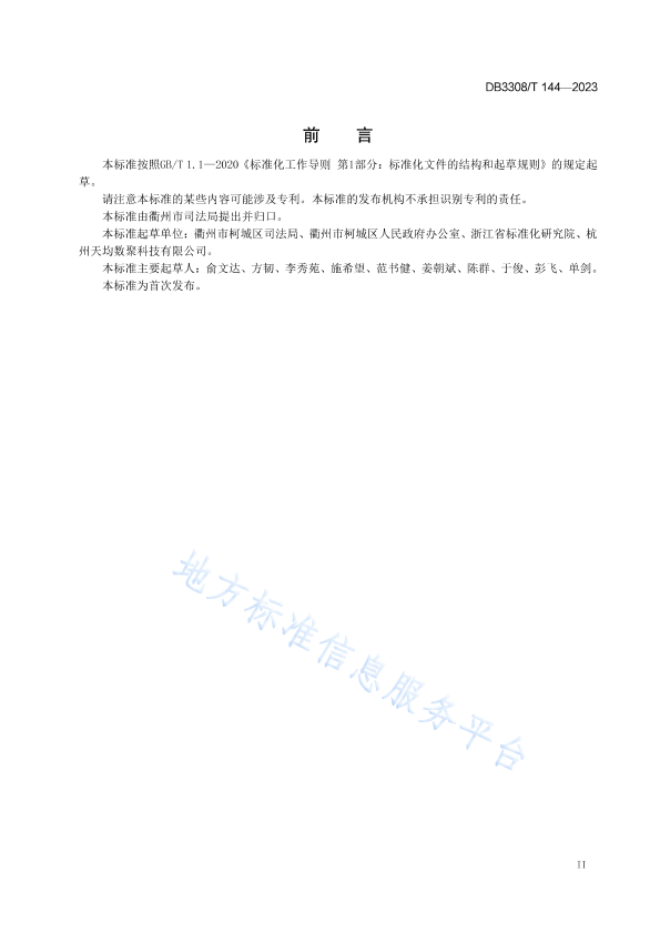 本标准按照GB/T 1.1 -2020《标准化工作导则第1部分:标准化文件的结构和起草规则》的规定起草。 请注意本标准的某些内容可能涉及专利。本标准的发布机构不承担识别专利的责任。 本标准由衢州市司法局提出并归口。 本标准起草单位:衢州市柯城区司法局、衢州市柯城区人民政府办公室、浙江省标准化研究院、杭州天均数聚科技有限公司。 本标准主要起草人:俞文达、方韧、李秀苑、施希望、范书健、姜朝斌、陈群、于俊、彭飞、单剑。 本标准为首次发布。