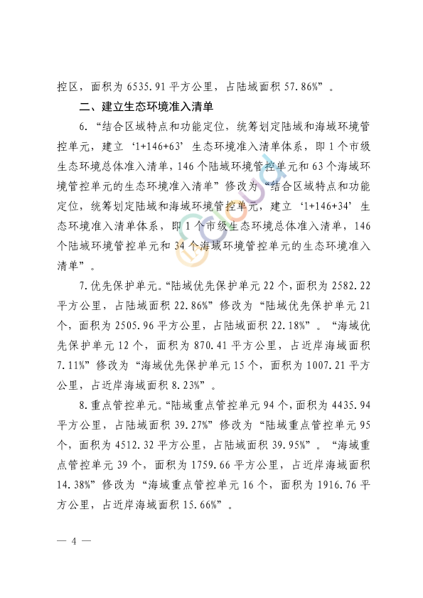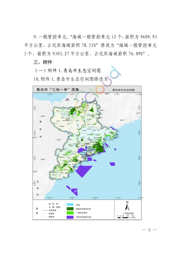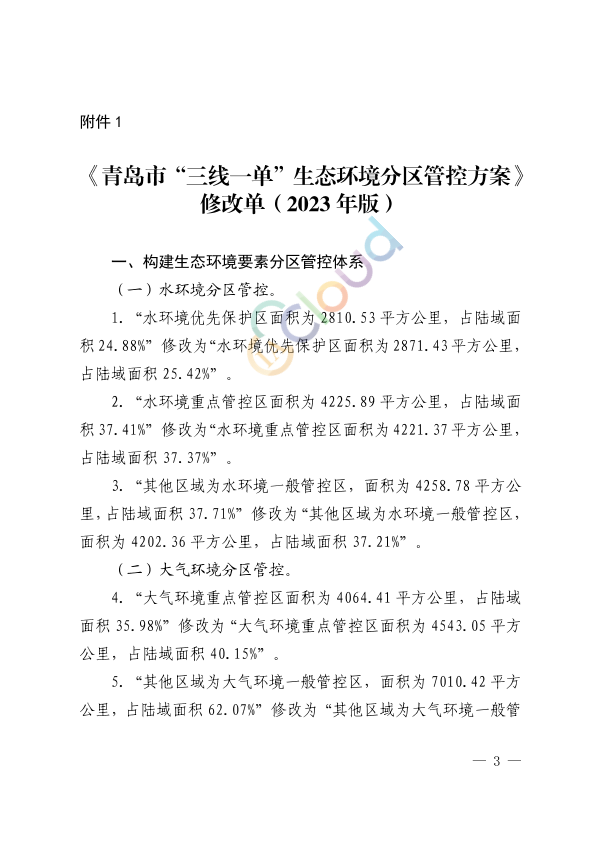 各区、市人民政府,青岛西海岸新区管委,市政府有关部门,市直有关单位: 为切实发挥“三线一单”生态环境分区管控作用,根据《关于印发山东省“三线一单”管理暂行办法的通知》(鲁环发〔2021〕16号)及《山东省2023年生态环境分区管控成果动态更新工作方案》(鲁环字〔2023〕53号)等要求,经市政府同意,我局对《青岛市“三线一单”生态环境分区管控方案》(以下简称《方案》)《青岛市环境管控单元生态环境准入清单(2022年版)》(以下简称《清单》)进行修改完善,制定了《方案》修改单(2023年版)和《清单(2023年版)》。 自发布之日起,本修改单和清单实施,《青岛市环境管控单元生态环境准入清单(2021年版)》及《〈青岛市环境管控单元生态环境准入清单〉修改单(2022年版)》作废。 附件:1.《青岛市“三线一单”生态环境分区管控方案》修改单(2023年版) 2.《青岛市环境管控单元生态环境准入清单(2023年版)》 青岛市生态环境局 2024年4月26日