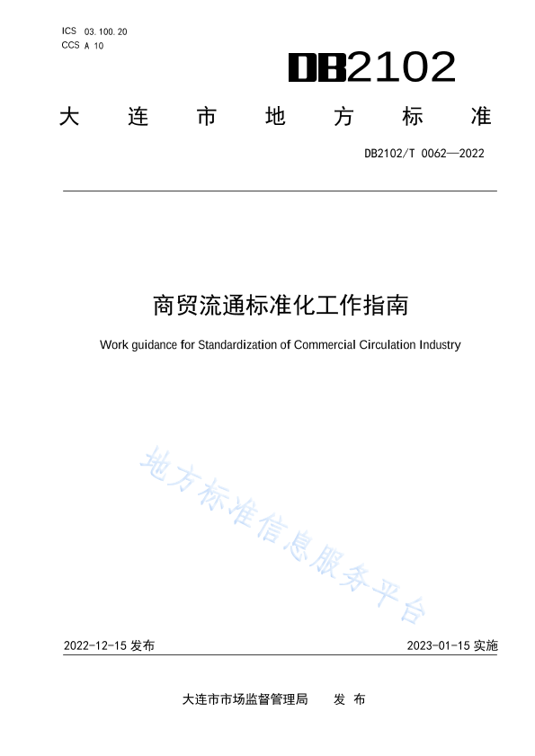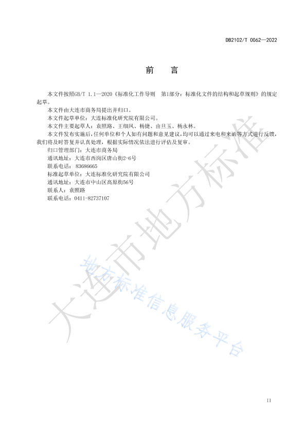 本文件按照GB/T 1.1-2020《标准化工作导则第1部分: 标准化文件的结构和起草规则》的规定起草。 本文件由大连市商务局提出并归口。 本文件起草单位:大连标准化研究院有限公司。 本文件主要起草人:袁照路、王细凤、杨捷、由旦玉、杨永林。 本文件发布实施后,任何单位和个人如有问题和意见建议,均可以通过来电和来函等方式进行反馈,我们将及时答复并认真处理,根据实际情况依法进行评估及复审。 归口管理部门:大连市商务局 通讯地址:大连市西岗区唐山街2-6号 联系电话: 83686665 标准起草单位:大连标准化研究院有限公司 通讯地址:大连市中山区高原街56号 联系人:袁照路 联系电话: 0411-82737107