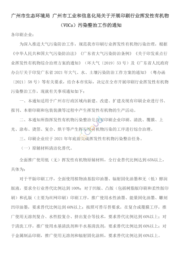 各印刷企业: 为深入推进大气污染防治工作,规范我市印刷行业挥发性有机物污染治理,根据《中华人民共和国大气污染防治法》《广东省大气污染防治条例》《关于印发重点行业挥发性有机物综合治理方案的通知》(环大气〔2019〕53号)及《广东省人民政府办公厅关于印发广东省2021年大气、水、土壤污染防治工作方案的通知》(粤办函〔2021〕58号)等有关要求,结合本市实际,决定在全市开展印刷行业挥发性有机物污染整治工作,现就有关事项通知如下:
