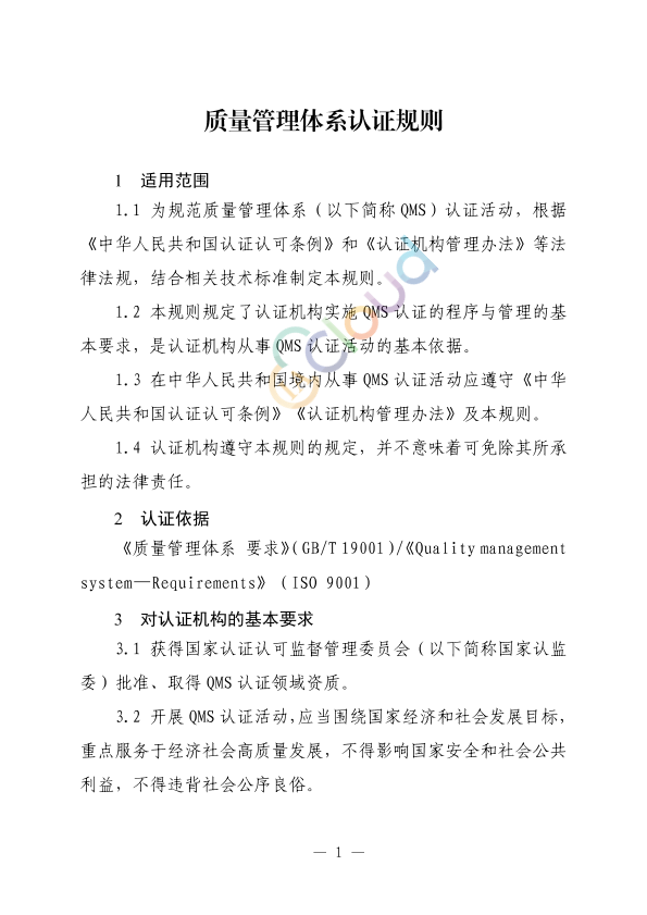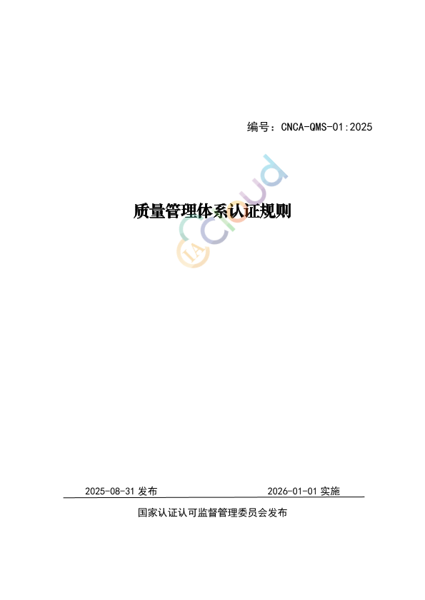 为进一步加强质量认证行业公信力建设,压实认证机构主体责任,提升质量管理体系认证有效性,依据《中华人民共和国认证认可条例》等法律法规,国家认监委组织对《质量管理体系认证规则》(国家认监委2016年第20号公告,以下简称旧版规则)进行了修订,形成了新版《质量管理体系认证规则》(以下简称新版规则),已经国家认监委委务会议通过,现予以公布并将有关事项公告如下: 一、新版规则自2026年1月1日起正式实施,旧版规则同时废止。 二、本公告发布之日起至2025年12月31日为认证规则换版过渡期,新旧版规则并行适用。过渡期内,对已持有旧版规则认证证书的组织,认证机构根据其申请,可按照新版规则结合年度监督或再认证审核实施换版审核,对符合新版规则要求的,换发新版规则认证证书,新证书有效期与原证书有效期一致。 三、自2026年1月1日起,质量管理体系认证活动应当按照新版规则实施。 四、认证机构应组织开展新版规则的学习培训,及时修订有关管理及技术文件,调整和完善认证程序,确保认证人员能力以及认证活动全过程符合新版规则的要求。 五、获证组织应加强新版规则的学习,提升人员能力,适时进行认证证书换版,确保质量管理体系满足新版规则要求。 附件: 《质量管理体系认证规则》 国家认监委 2025年8月31日