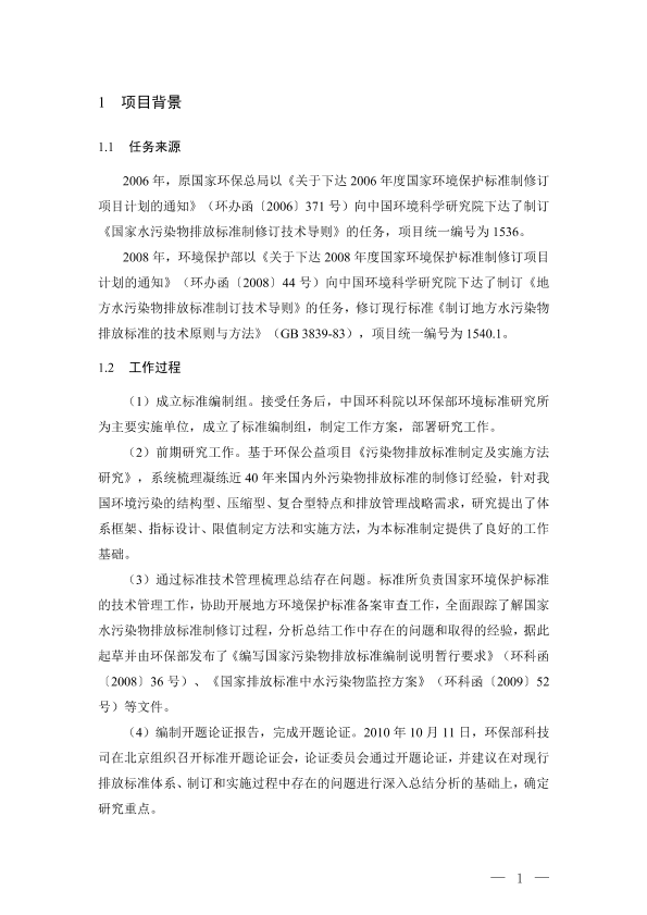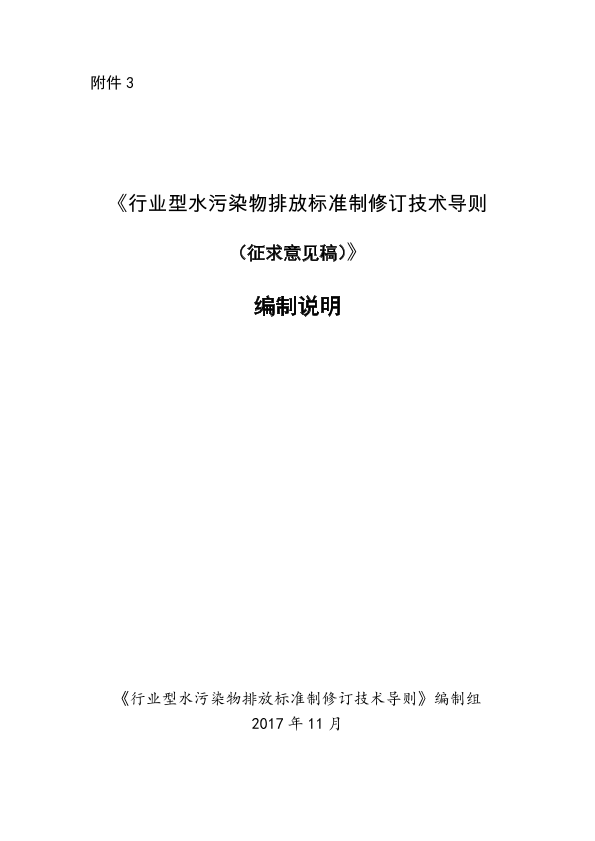 为贯彻《中华人民共和国环境保护法》《中华人民共和国水污染防治法》《中华人民共和国海洋环境保护法》,落实《国家环境保护标准制修订工作管理办法》《加强国家污染物排放标准制修订工作的指导意见》,保护和改善水环境质量,规范行业型水污染物排放标 准制修订工作,明确标准制定技术要求,保证标准质量,制定本标准。 本标准规定了水污染物排放标准体系设置及分类、行业型水污染物排放标准制定的基本原则、标准文本一般构成与编写要求、工作程序与技术程序、标准制定的主要工作内容 与方法,以及标准编制说明和技术研究报告的主要内容要求。 本标准的附录 A、附录 B 为资料性附录。 流域型水污染物排放标准制修订技术导则由 HJ□□□规定。 本标准为首次发布。 国家水污染物排放标准的制修订工作程序按照《国家环境保护标准制修订工作管理办 法》(国环规科技〔2017〕1 号)规定的相关要求执行;标准的结构和编写排版规则等执 行《环境保护标准编制出版技术指南》(HJ 565),本标准不再规定相关内容。 自本标准实施之日起,《国家排放标准中水污染物监控方案》(环科函〔2009〕52 号)、 《编写国家污染物排放标准编制说明暂行要求》(环科函〔2008〕36 号)中关于水污染物 排放标准的要求废止。 本标准由环境保护部科技标准司组织制订。 本标准主要起草单位:中国环境科学研究院。 本标准环境保护部 2□□□年□□月□□日批准。 本标准自 2□□□年□□月□□日实施。 本标准由环境保护部解释。