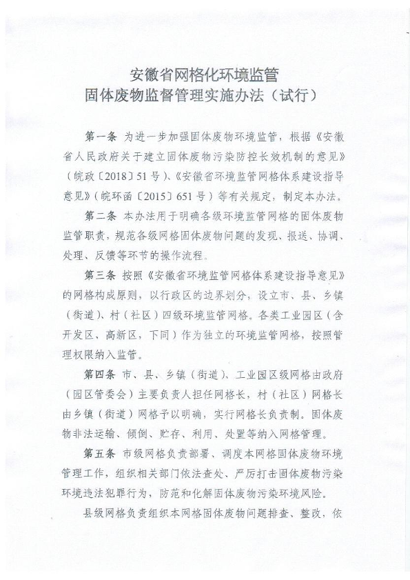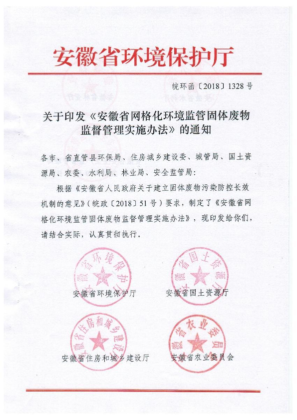 各市、省直管县环保局、住房城乡建设委、城管局、国土资源局、农委、水利局、林业局、安全监管局: 根据《安徽省人民政府关于建立固体废物污染防控长效机制的意见》(皖政[2018]51号)要求,制定了《安徽省网格化环境监管固体废物监督管理实施办法》,现印发给你们,请结合实际,认真贯彻执行。 安徽省环境保护厅 安徽省国土资源厅 安徽省住房和城乡建设厅 安徽省农业委员会 安徽省水利厅安徽省林业厅 安徽省安全生产监督管理局 2018年9月30日