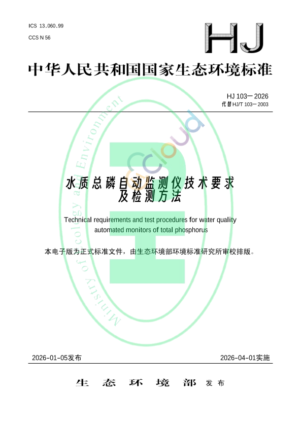 本标准规定了水质总磷自动监测仪的技术要求及检测方法。 本标准适用于地表水、生活污水和工业废水的水质总磷自动监测仪的检测,该类仪器的设计、生产可参照使用。 水质总磷自动监测仪的量程应包含 0.02 mg/L~50 mg/L。